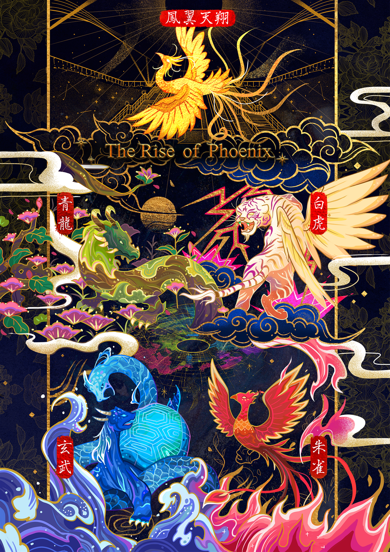 「鳳翼天翔~EARTH ‧地之篇」展演場域在美麗島站,以公共藝術「光之穹頂」為主,結合水、土、光、火四大元素為延伸概念 的地面投影,透過萬物的榮辱衰興,體現生命之美。主秀設計以地面投影結合座落在車站的四大神獸「青龍」、「白虎」、「朱雀」、「玄武」的神話意象,以四大元素演繹生命的起源及繁榮、毀滅到重生的過程,述說周而復始的生命禪意。