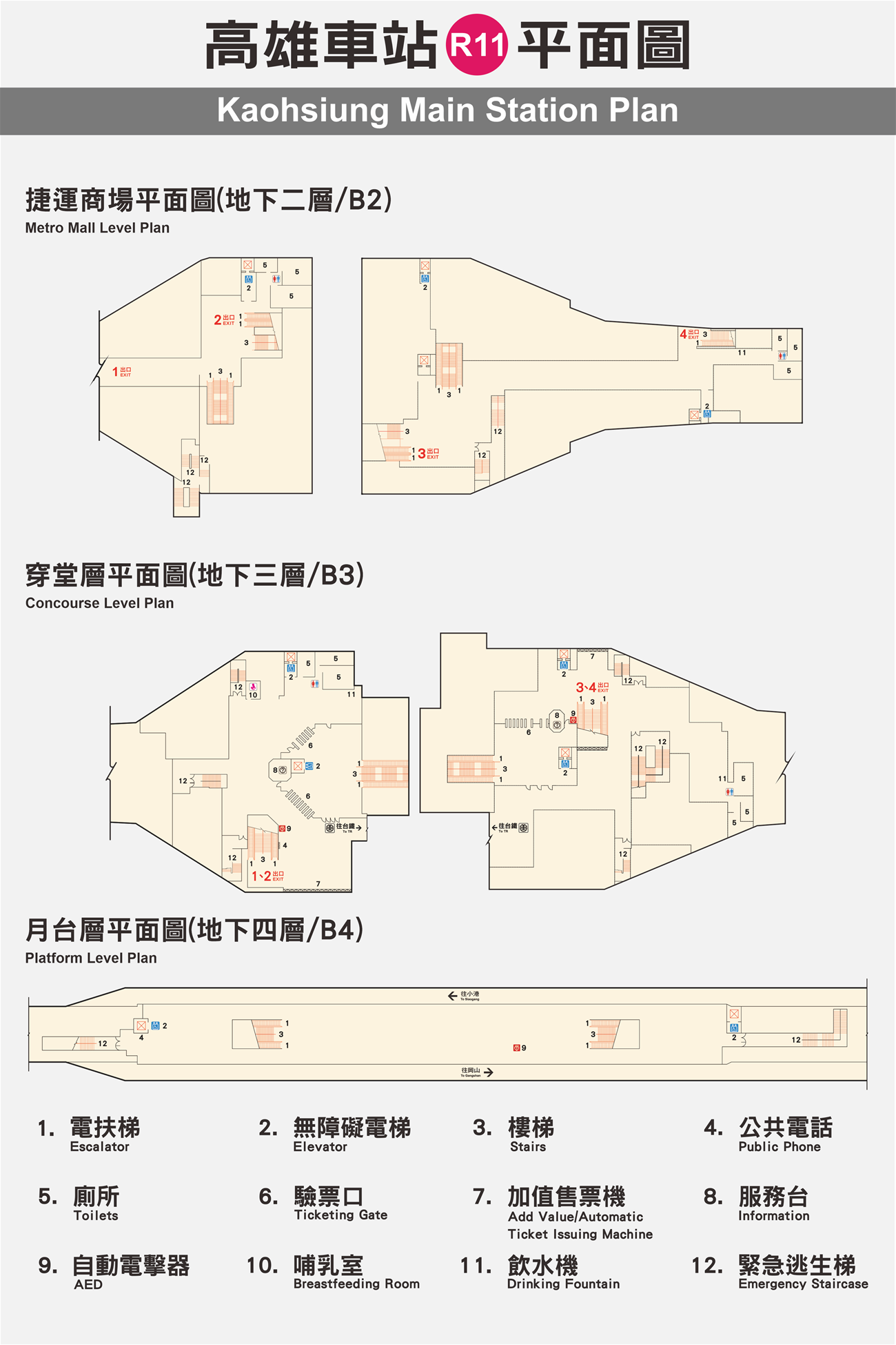 ●Unpaid Area is Co-constructed with Kaohsiung Main Station and located on Third Basement Floor of it with Stairs、Escalator、Accessible Elavator、Ticketing Gate、Information、Add Value / Automatic Ticket Issuing Machine、Payphone、AED and Toilet (including Accessible Toilet).